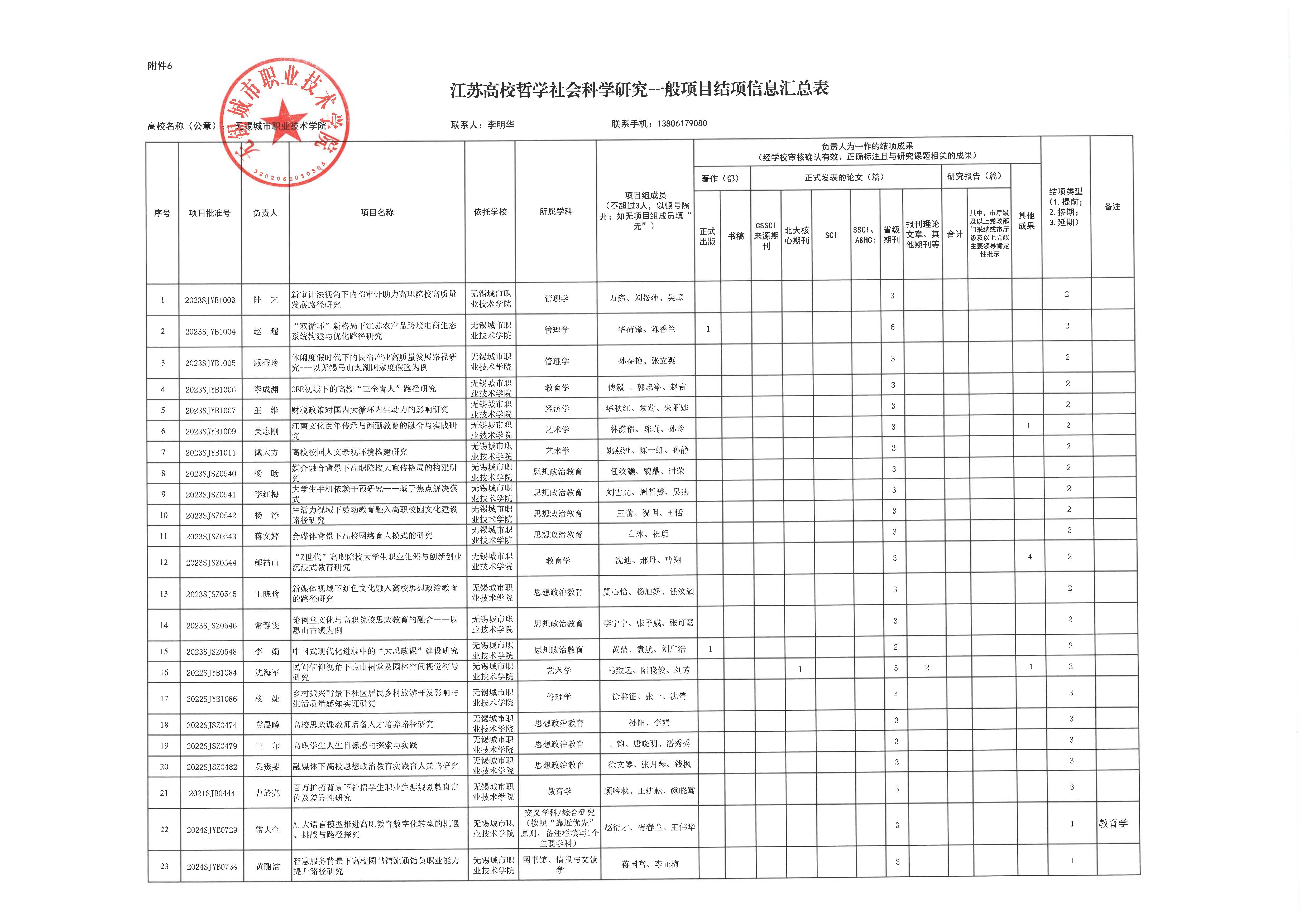 根据《省教育厅办公室关于做好2025年度高校哲学社会科学研究项目中期检查和结项验收工作的通知》(苏教办社政函〔2025〕17号)文件要求,经项目结题申报、科技处初审、校外专家评审,现将结题评审情况予以公示(详见下表)。公示时间2026年1月14日-1月18日。在公示期间,如有异议,请以书面形式向科技处、纪委办公室反映。科技处电话83276077,纪委办公室电话83276066。 无锡城市职业技术学院 2026年1月14日